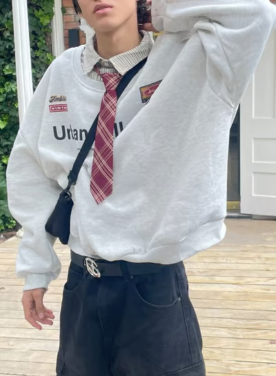 Další varianta, která je za mě cool, je kravata přes svetr. Ideálně oversize, kde zpod něj vykukuje jen límeček košile nebo polo tričko. Stejně dobře funguje i kravata přes mikinu přes hlavu, není to nejvíc kreativní way, ale pokud máš fakt dobrý svetr nebo mikinu, výsledek je automaticky netradiční a cool.