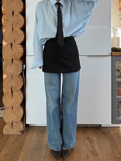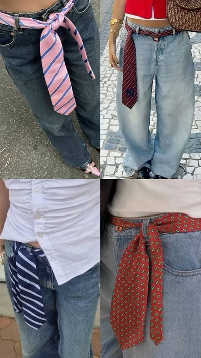 Oversize džíny, jednoduché triko/top a kravata provlečená poutky místo pásku. Ideálně v barvě nebo vzoru, který celý outfit trochu ozvláštní. Je to přesně ten detail, který vypadá, jako že ses moc nesnažila ale výsledek je chic fit.