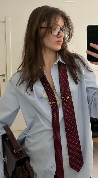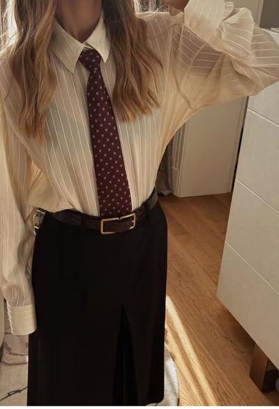 S kravatou se dá ale vyhrát mnohem víc. Nejde o to ji nosit „správně“, ale brát ji jako doplněk a trochu si s ní kreativně pohrát. Jedna z nejjednodušších variant je nechat kravatu úplně rozvázanou a jen ji přehodit kolem krku jako šálu. Funguje skvěle k jednoduchému hezkému topu a pokud zvolíš barevnou nebo vzorovanou kravatu, outfit se tím okamžitě rozbije a získá cool twist.