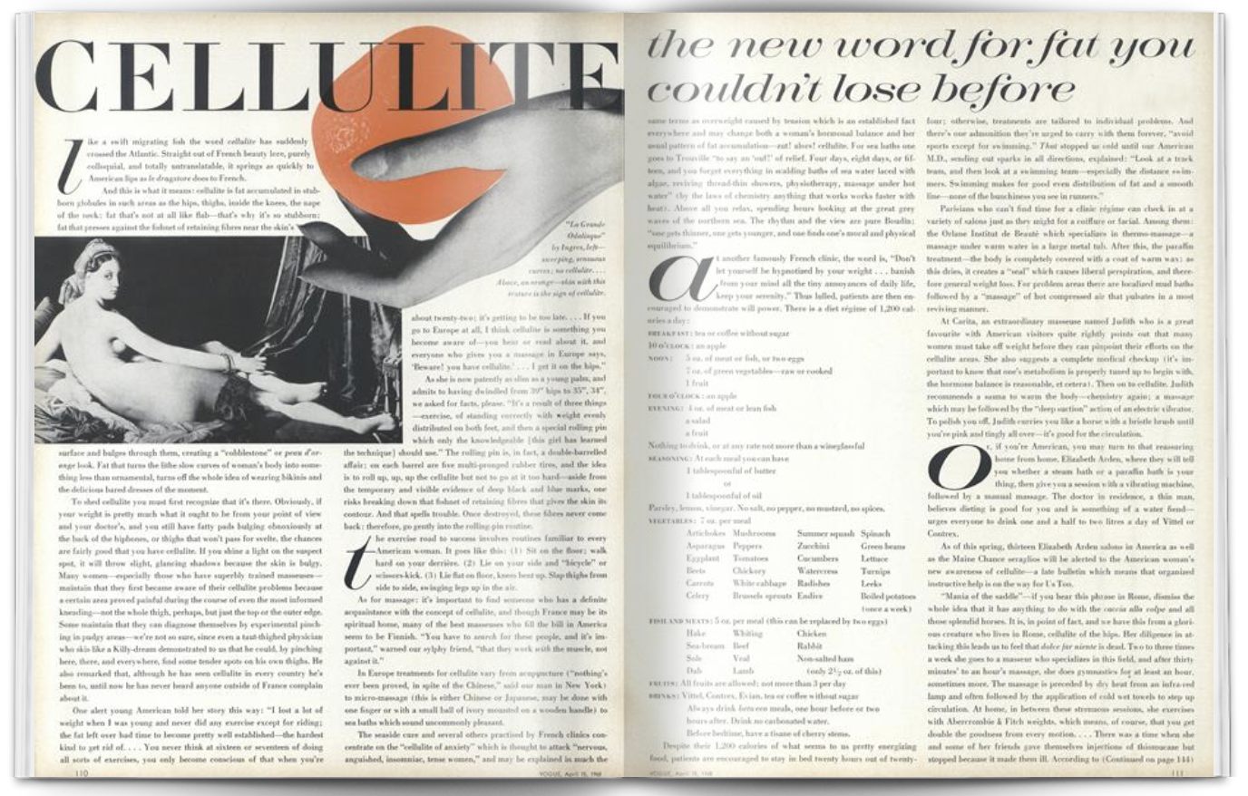 Tento text inspirovaný knihou Nicole Ronsardové, představil americkým ženám termín původně z francouzského lékařského prostředí 19. století. Článek ale udělal něco zásadnějšího než jen rozšíření slovní zásoby - vytvořil zcela novou kategorii zbytků a toxinů, která tvoří gelovitou hmotu odolnou vůči běžným dietám. Tato definice byla z lékařského hlediska nepřesná, ale marketingově geniální. Nazvat celulitidu „speciálním stavem“ na jednu stranu mnohým ženám přineslo úlevu od trápení se tím, že jim cvičení nemění strukturu jejich stehen, na druhou stranu to však přineslo úzkost, protože na speciální stav „potřebuješ“ speciální (a drahé) produkty.
